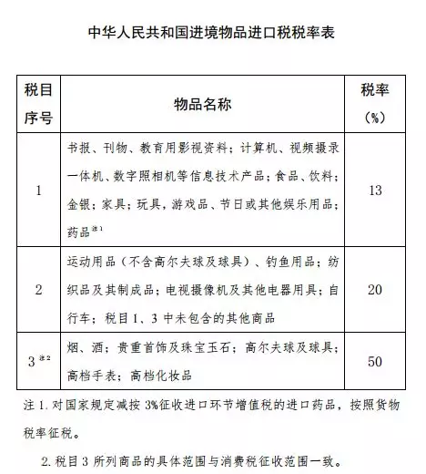 一、将进境物品进口税税目1、2的税率分别调降为13%、20%。
